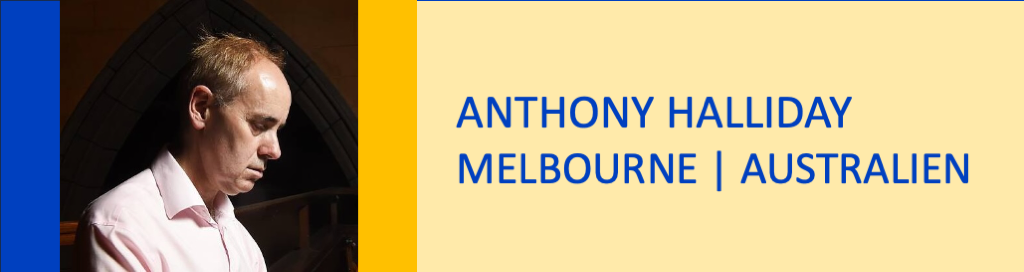 Seine Dissertation mit dem Titel „Schriftlicher Text: Eine Ressource für die Aufführungspraxis von Beethovens Klaviersonaten op. 106, 110 und 111 im christologischen Kontext“ liefert erstmals eine fundierte Erklärung für die Bedeutung der Hammerklavier-Sonate. Die Dissertation ist in der Bibliothek des Beethoven-Geburtshauses in Bonn hinterlegt. Anthony Halliday trat bei internationalen Musikfestivals in Köln, Bonn, Rom, Bochum und Bocholt auf. In London trat er in der Wigmore Hall, der Queen Elizabeth Hall, Westminster Abbey, der Westminster Cathedral und der St. Paul’s Cathedral auf und spielte Konzerte mit Solisten des BBC Symphony Orchestra und des St. Cecilia Chamber Orchestra. Er erhielt hervorragende Kritiken von der Times, dem Daily Telegraph und dem Guardian. Er gewann den ABC Commonwealth Concerto Wettbewerb mit Bartóks zweitem Klavierkonzert, begleitet vom Sydney Symphony Orchestra, und spielte alle 32 Klaviersonaten Beethovens ein. Außerdem spielte er die kompletten 48 Präludien und Fugen aus dem Wohltemperierten Klavier von J. S. Bach auswendig. In einer seltenen Leistung gewann er alle sieben ersten Preise bei den Prüfungen zum Royal College of Organists, London Fellowship, und die Silbermedaille der Worshipful Company of Musicians, London. Zu seinen Kompositionen gehören die Symphonie für Kleve, Deutschland, Drei Fugen für Klavier und die Missa Celebrationis für Doppelchor und Orchester, die 2017 in Bonn uraufgeführt wurde. Er ist stellvertretender Musikdirektor und Hauptorganist der St. Francis Church und der Blessed Sacrament Community in Melbourne. Konzertkritiken: „Einer der größten Organisten der Welt“ (Lefford Volkszeitung, Deutschland); „Großmeister der Tasteninstrumente“ (El Diario, Spanien)